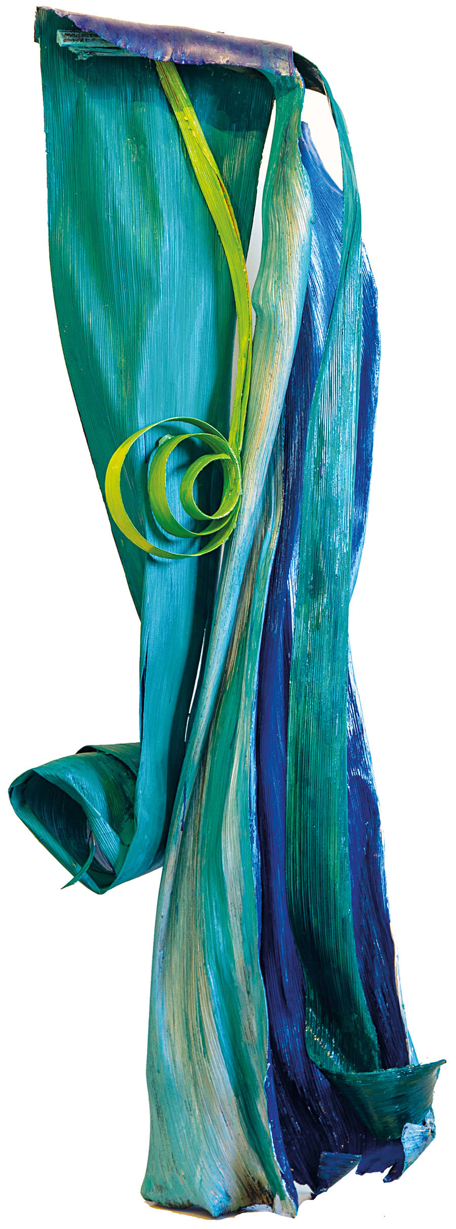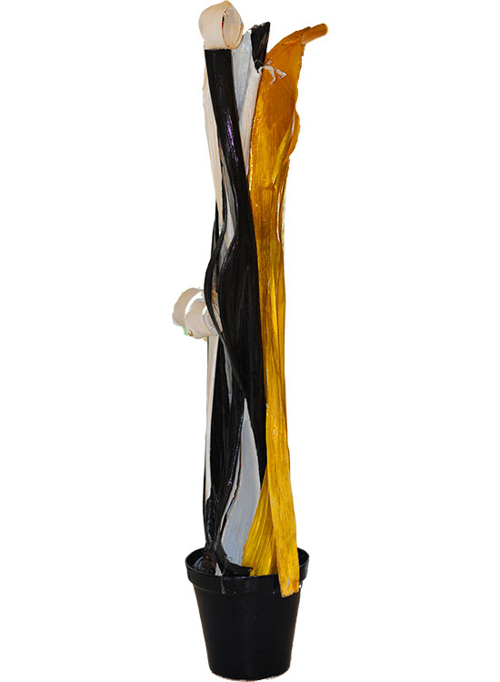 In Marja's Caribbean garden there are, among other vegetation, some beautiful palm trees; one of the perks of living in Curaçao. Although tropical, and thus not subject to the harsh winter of more temperate regions, palm trees do occasionally lose a leaf. As befits her artistic mind, the most common objects transform themselves into artistic possibilities. So it happens that in two thousand seventien she began working with the lower part of some of these fallen bark.