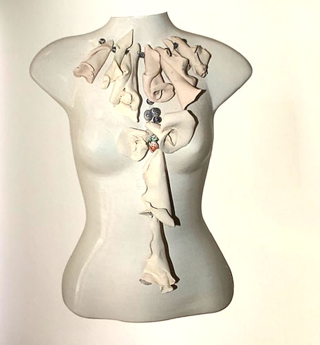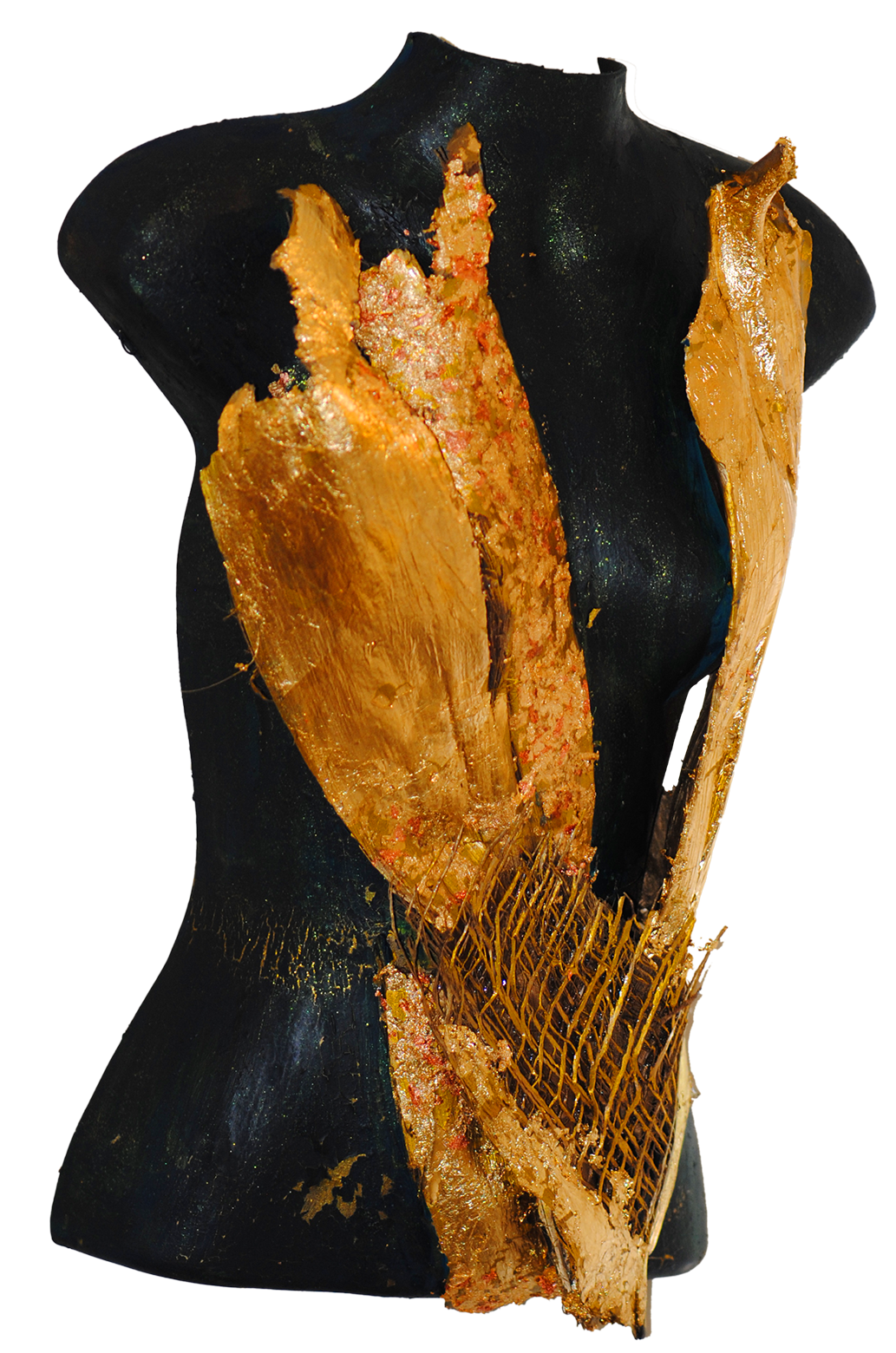 In 2004, Marja is in the Netherlands for a longer period of time. While walking along the Albert Cuypstraat, gaining new inspiration, she comes across several torsos of mannequins. Struck by the numerous artistic possibilities of this new material, she asks the shop owner if she can buy some 25 of them, some with a head, some of them headless. Once delivered at her home, she initially uses the material itself as a base to work with, applying only oil paint, but soon afterwards starts adding ceramics, tree bark, and/or sea shells. In a later stage she uses mannequins as a mold, filling them up with papier-mâché (a substance made from paper pulp that can be molded when wet and painted when dry) and using the hardened filling as the main material to work with. At an even later stage, the created pieces also receive a background, and some of them a headdress.